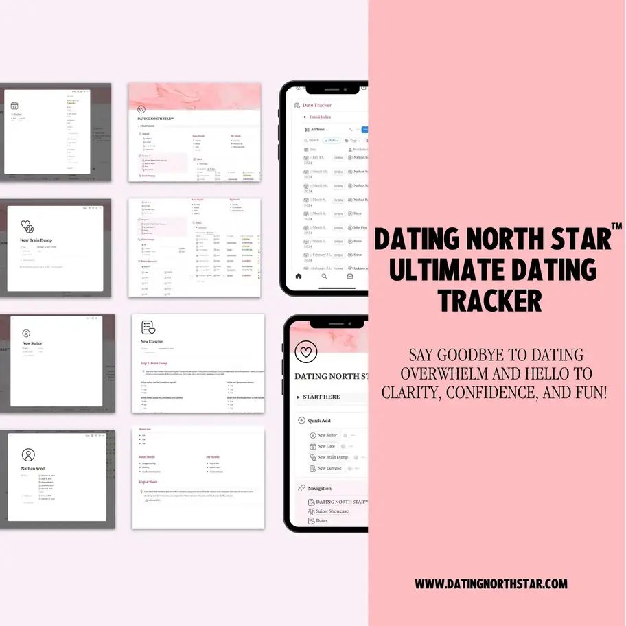 Say goodbye to dating overwhelm and hello to clarity, confidence, and fun! The DATING NORTH STAR™ Ultimate Dating Tracker is your personalized tool for navigating the modern dating world with intention and ease. Powered by Notion, this tracker simplifies every step of your dating journey, helping you focus on what truly matters—your values, needs, and goals.